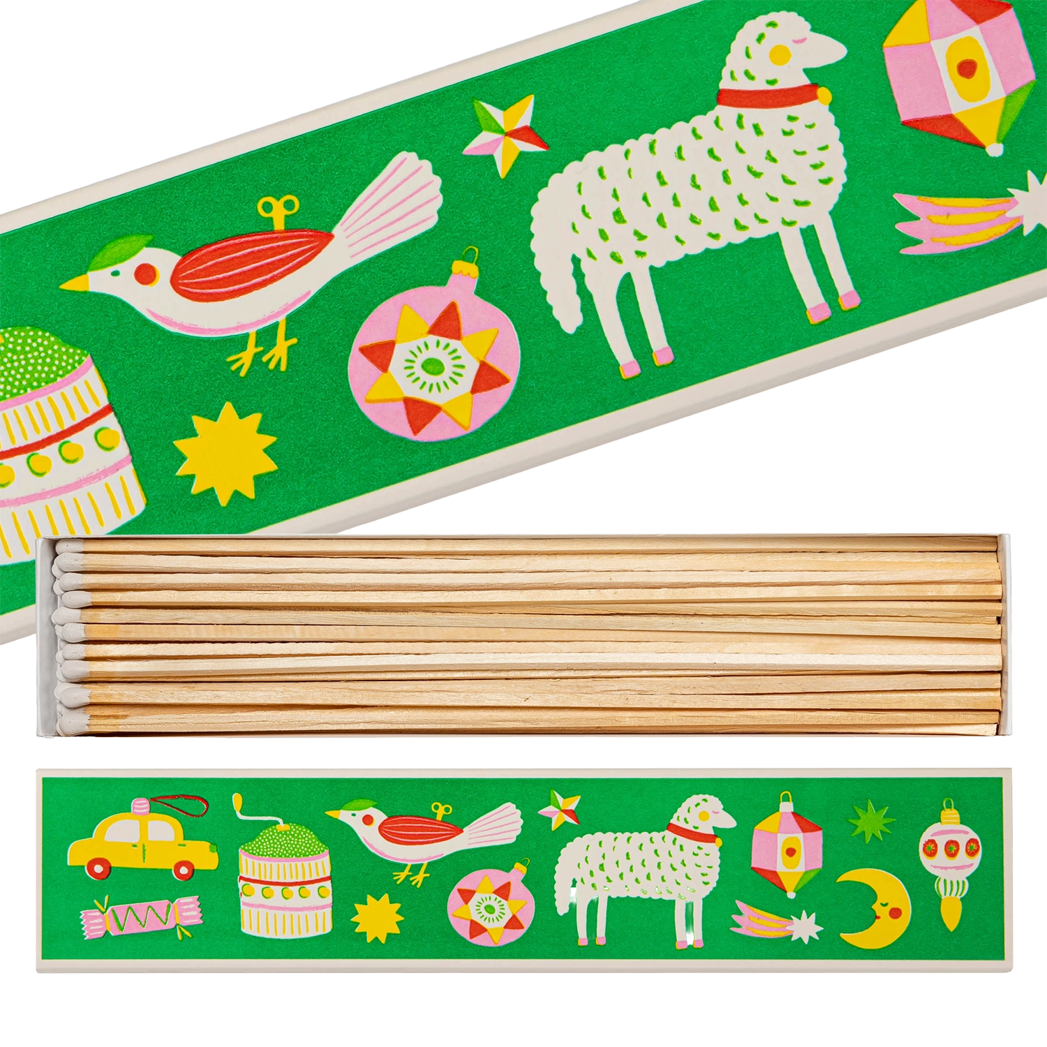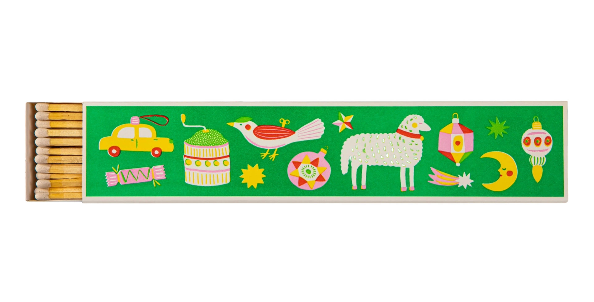 Long matchbox featuring an array of Christmas ornaments in various bright colours on a bold green background.