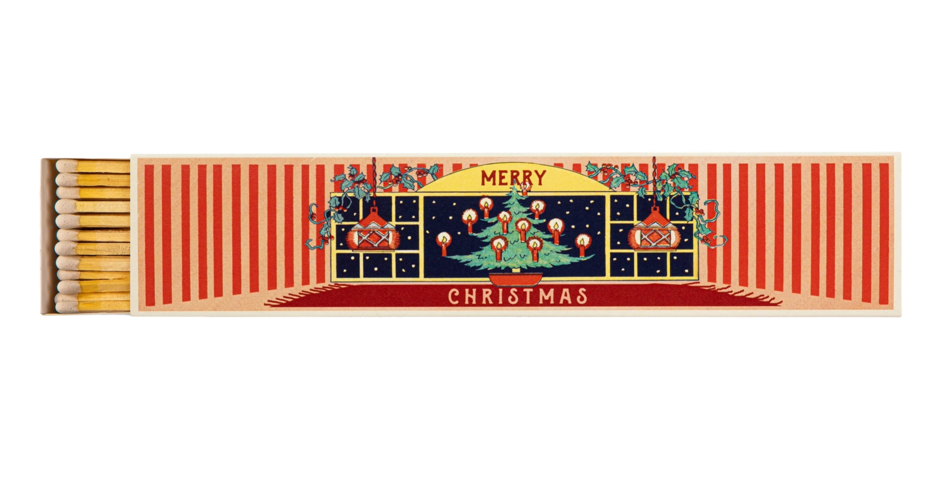 Long matchbox featuring a festive scene with a decorated Christmas tree in front of a big open window with the words 'Merry Christmas.'