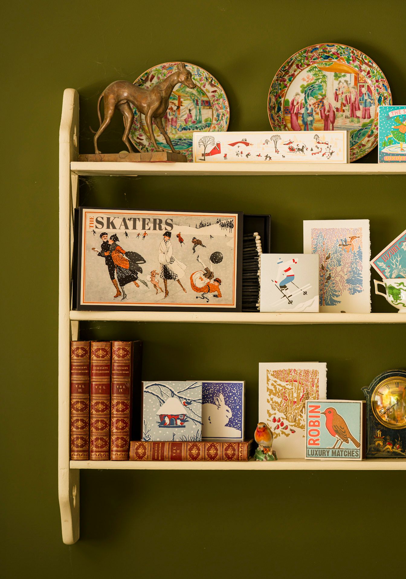 Giant matches featuring a frozen lake with figures skating about in their winter clothes while it snows, with the words 'The Skaters.'