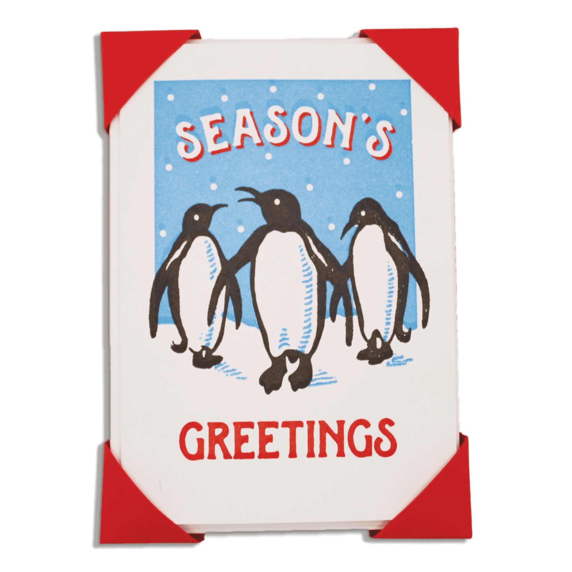Letterpress card featuring three penguins waddling in the snow with the words 'Season's Greetings.'