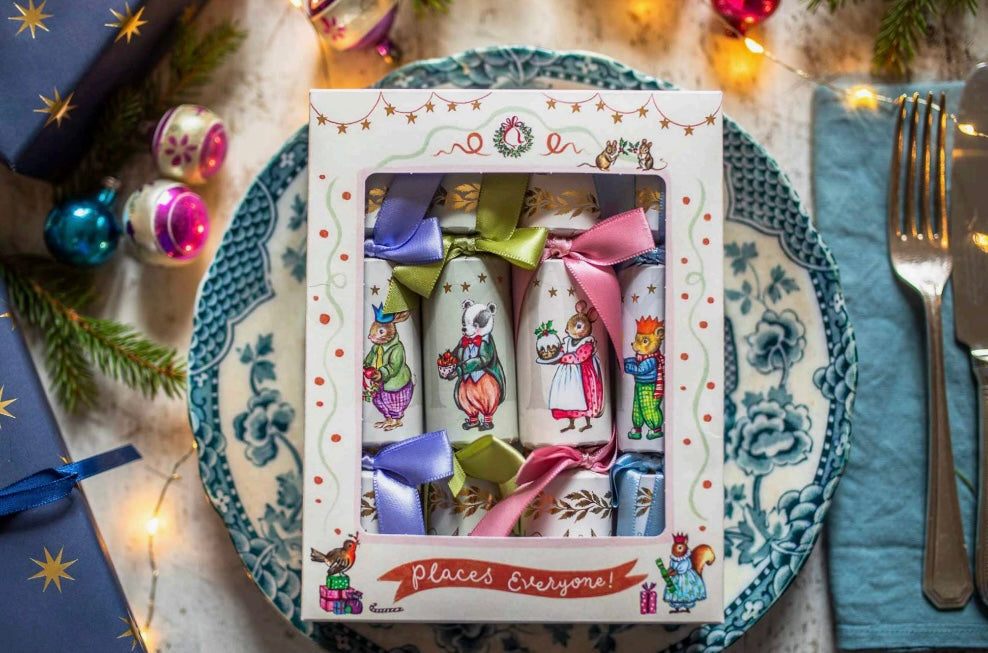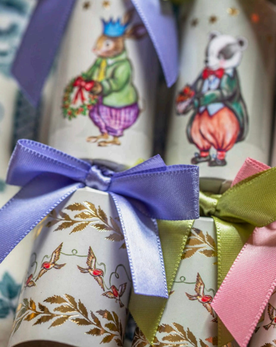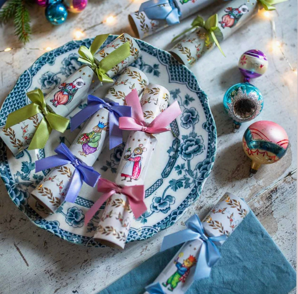 A set of 4 beautifully dainty crackers (8 inches to be exact) filled with Christmas themed chocolate truffles and the traditional gold paper hat and motto. A perfect dinner table addition for little people at Christmas time.