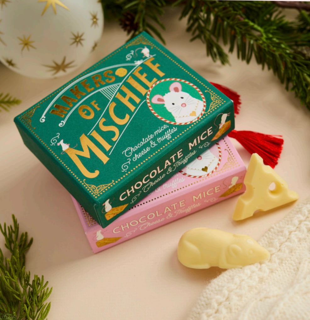 This beautifully festive green matchbox is home to two delicious white chocolate mice and two pieces of white chocolate cheese.