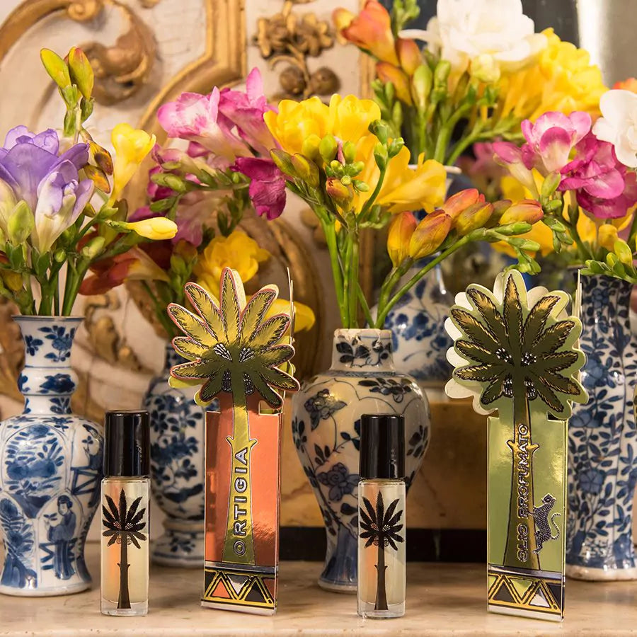 Ortigia's precious glass bottle - the size of your small finger - is filled with perfumed oil and fitted with a roller-ball top. Perfect for popping in your handbag to carry Ortigia's exotic scents with you wherever you go.