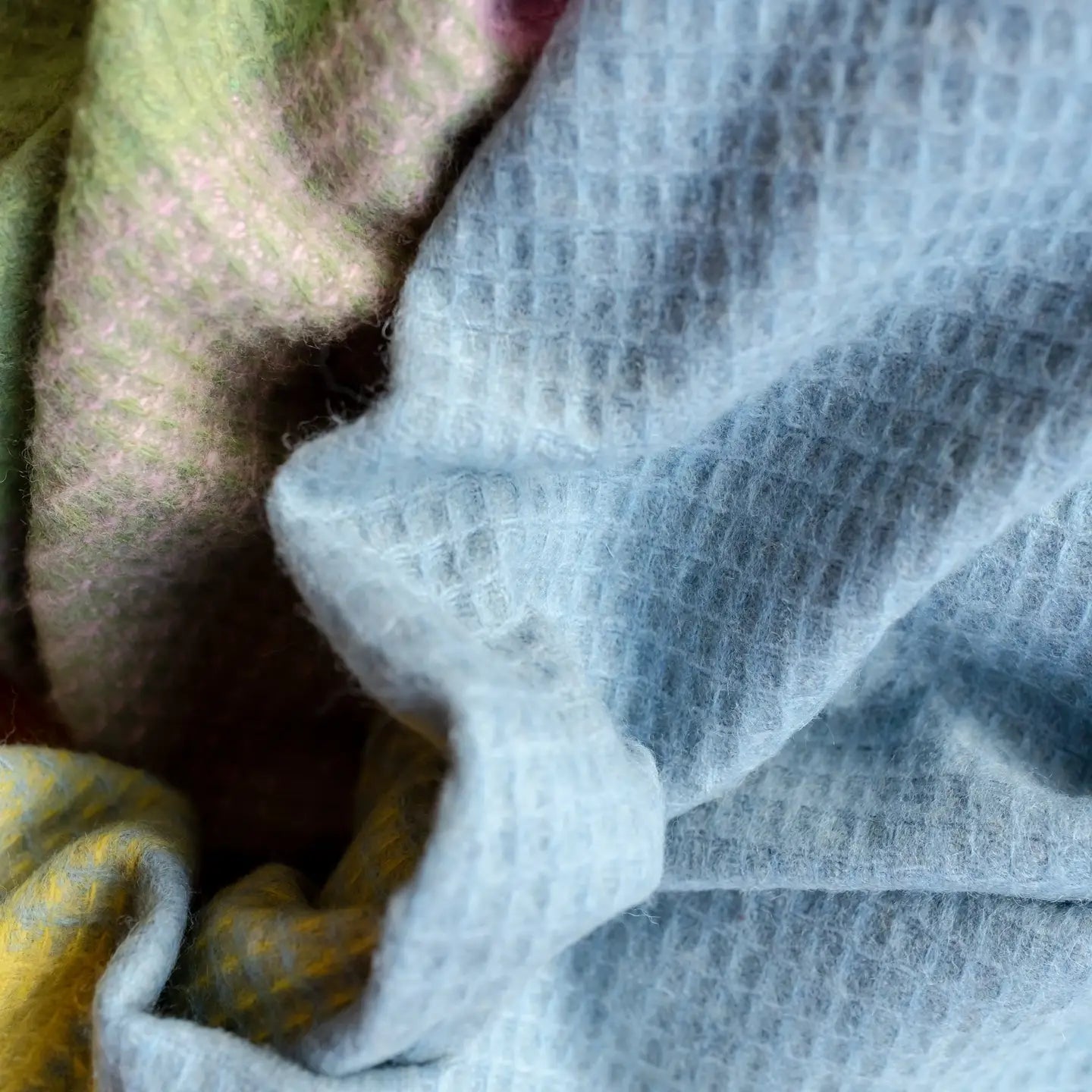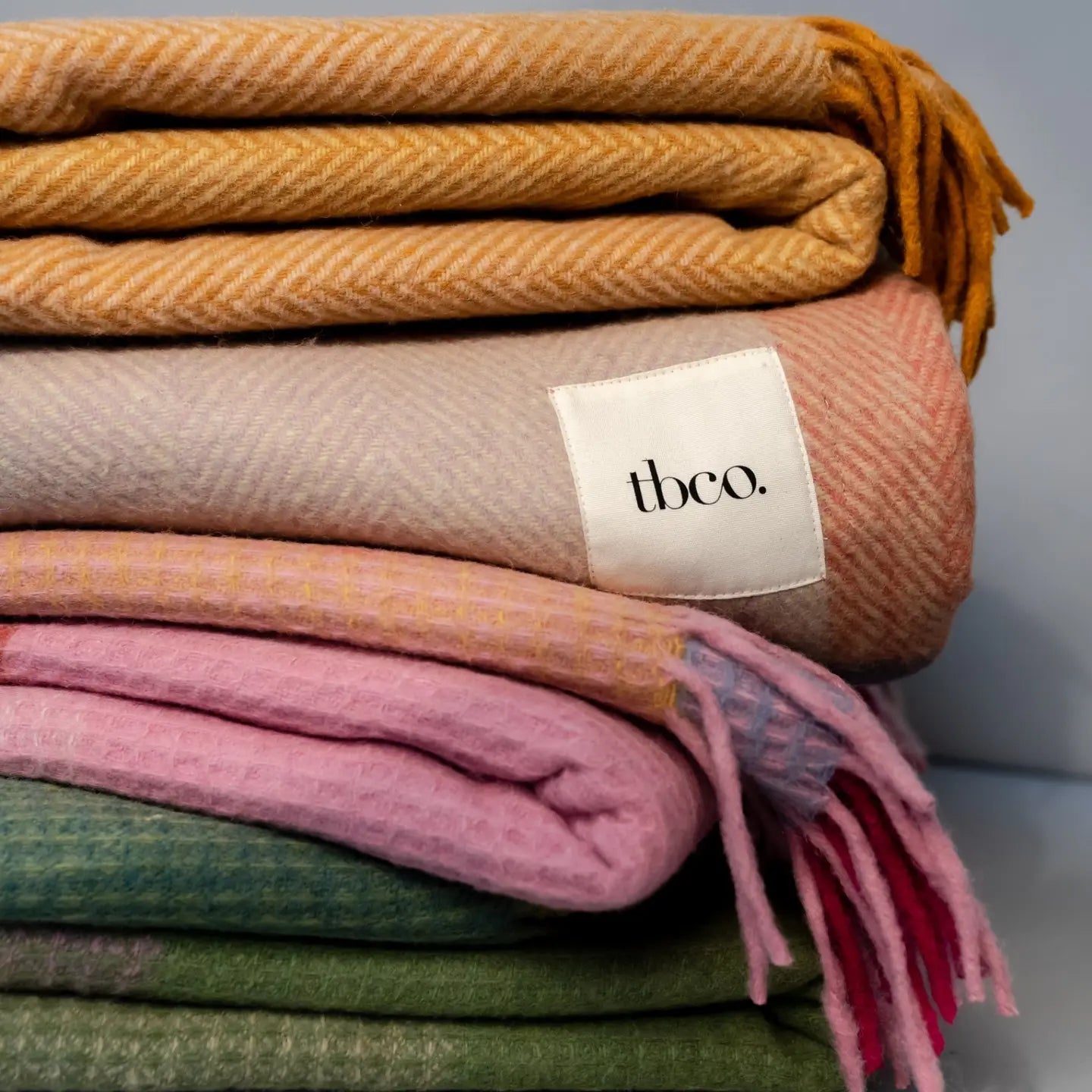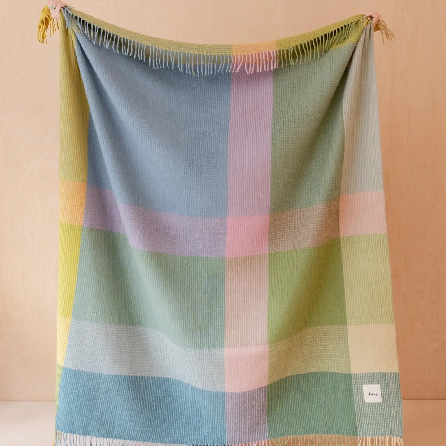 This vibrant TBCO blanket with fringe in a green, blue, pink and yellow block check pattern is the perfect companion for cosy moments. Its comfy waffled texture adds interest to any space. Crafted from 70% recycled wool and 30% mixed fibres, it combines the natural warmth, durability, and softness of wool with a commitment to sustainability, saving an average of six garments from landfill. Its dense weave provides exceptional warmth and comfort, while its machine-washable design ensures easy care, making it ideal for everyday use.