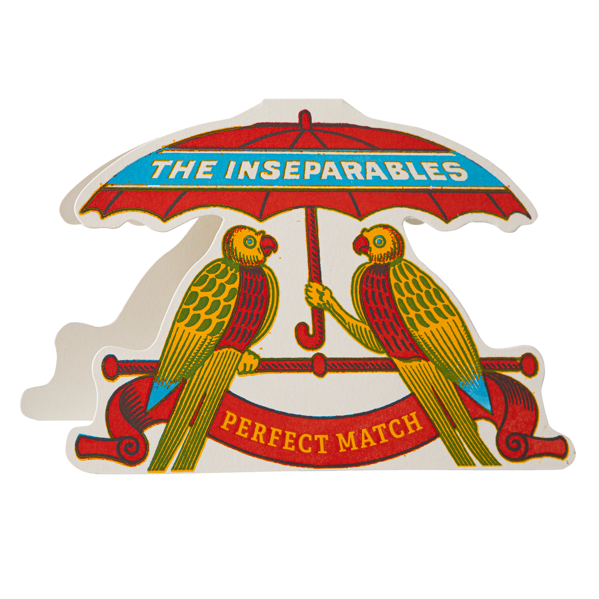 Our letterpress cut-out card featuring two birds sitting under an umbrella together with the words 'The Inseparables, Perfect Match.'